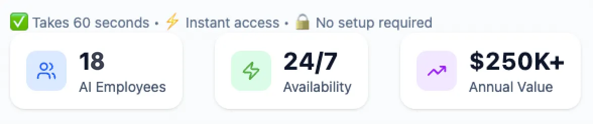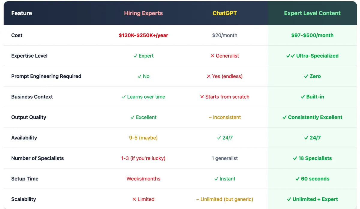 ChatGPT is a generalist that requires constant prompt engineering and produces inconsistent results. Our AI employees are ultra-specialized experts trained to $120K-$250K/year professional level in their specific domains. They understand business context, require zero prompt babysitting, and deliver consistent expert-level output every time. Think of ChatGPT as a general intern vs. our AI employees as seasoned specialists.